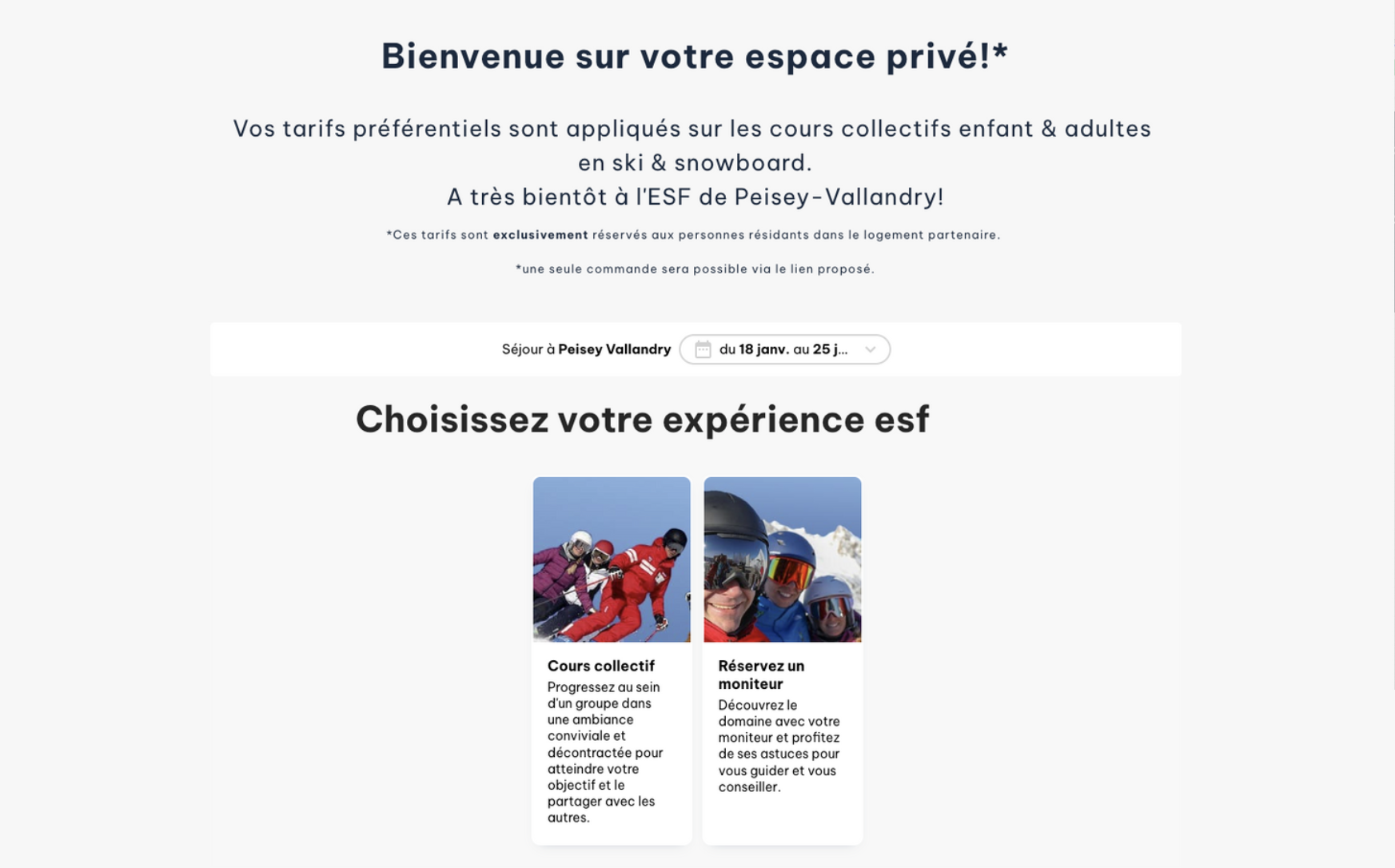- La page Tunnel : où les clients se connectent et peuvent choisir les cours de ski qu’ils souhaitent acheter.