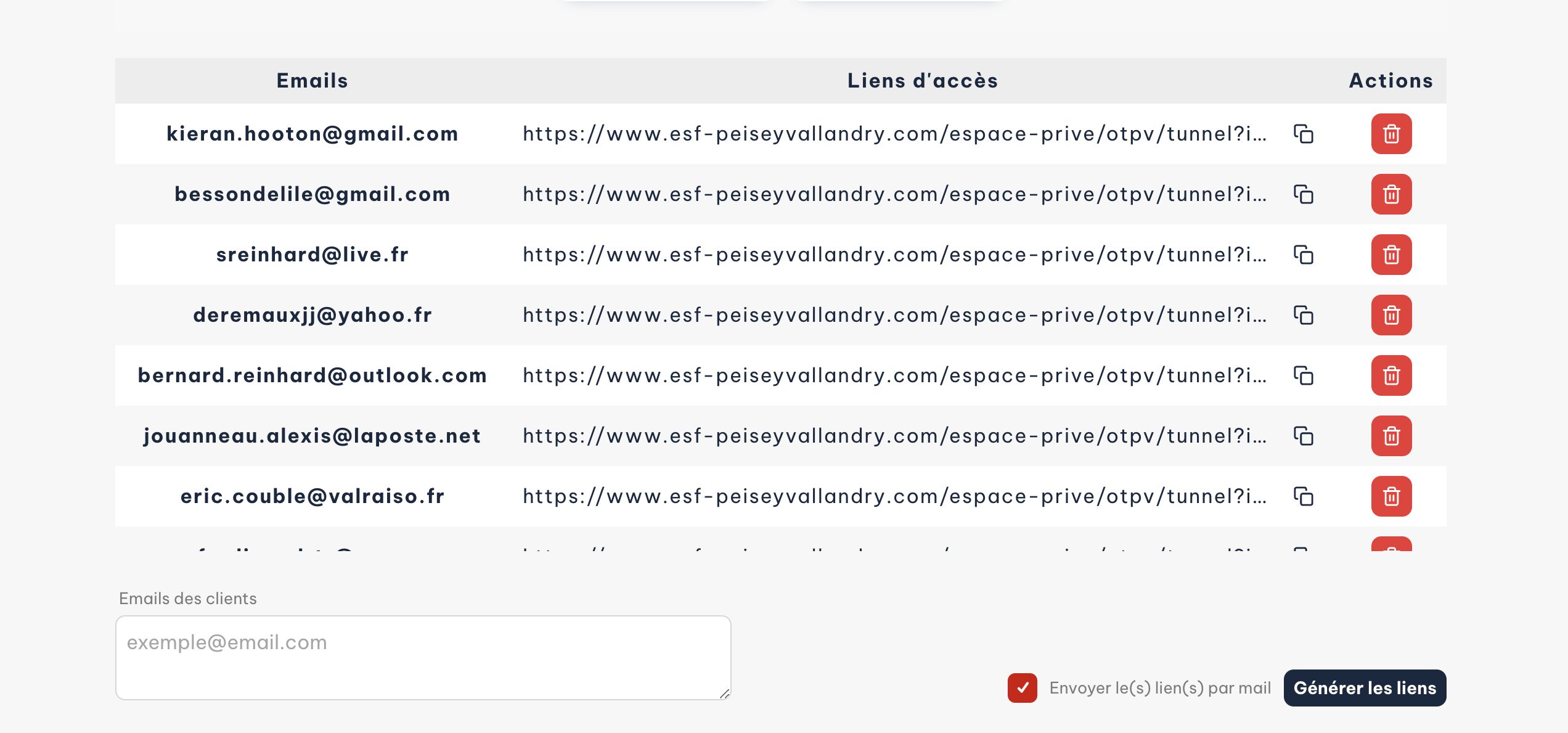 - Vous pouvez copier ou supprimer les liens en cliquant sur les boutons d'action à droite.