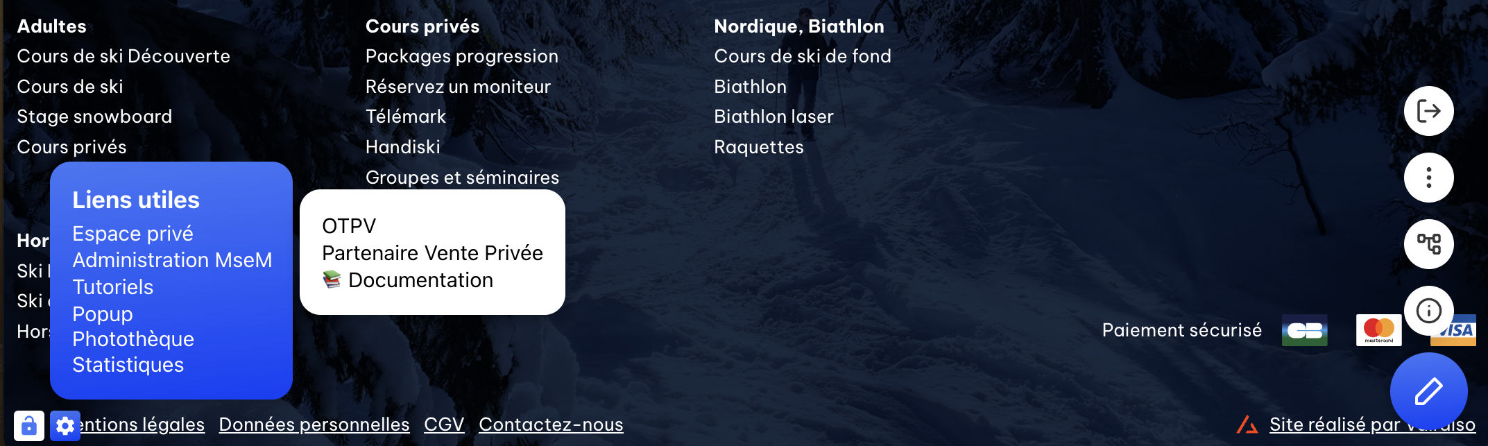 - Vous trouverez un accès aux espaces privés via le bouton “Liens utiles” (icône en forme de roue crantée) situé à gauche du pied de page de votre site esf.
