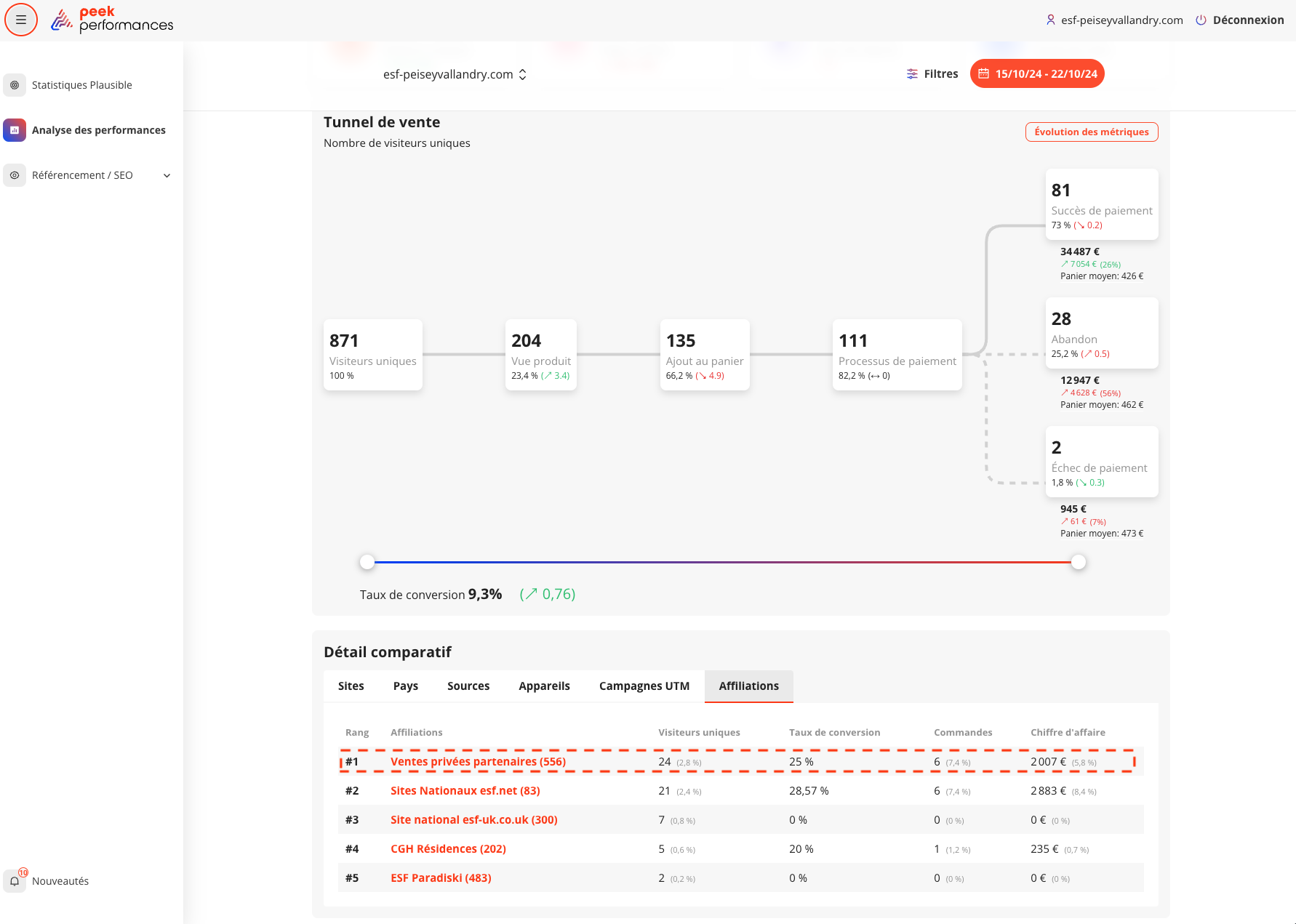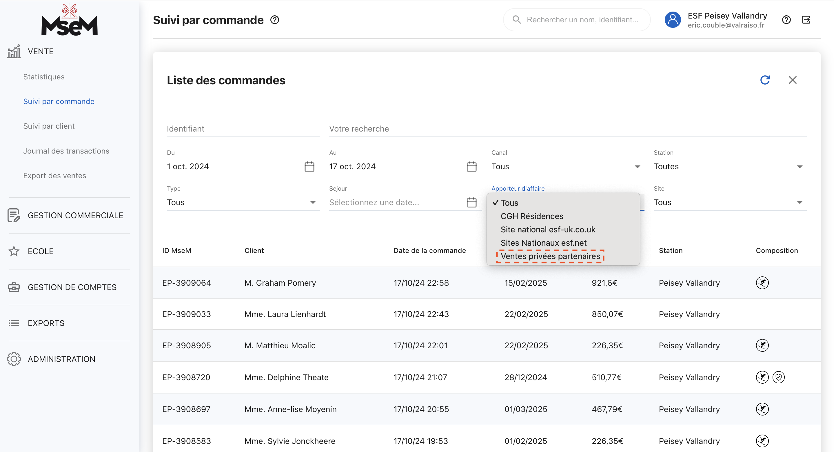 Pour suivre les ventes réalisées via les Espaces privés, nous avons intégré un code d’affiliation (hoteid=556 “Ventes privées partenaires”). Ce code permet à l’école de visualiser les ventes dans le Back Office MSEM ou dans l’outil de statistique Peek Performance.