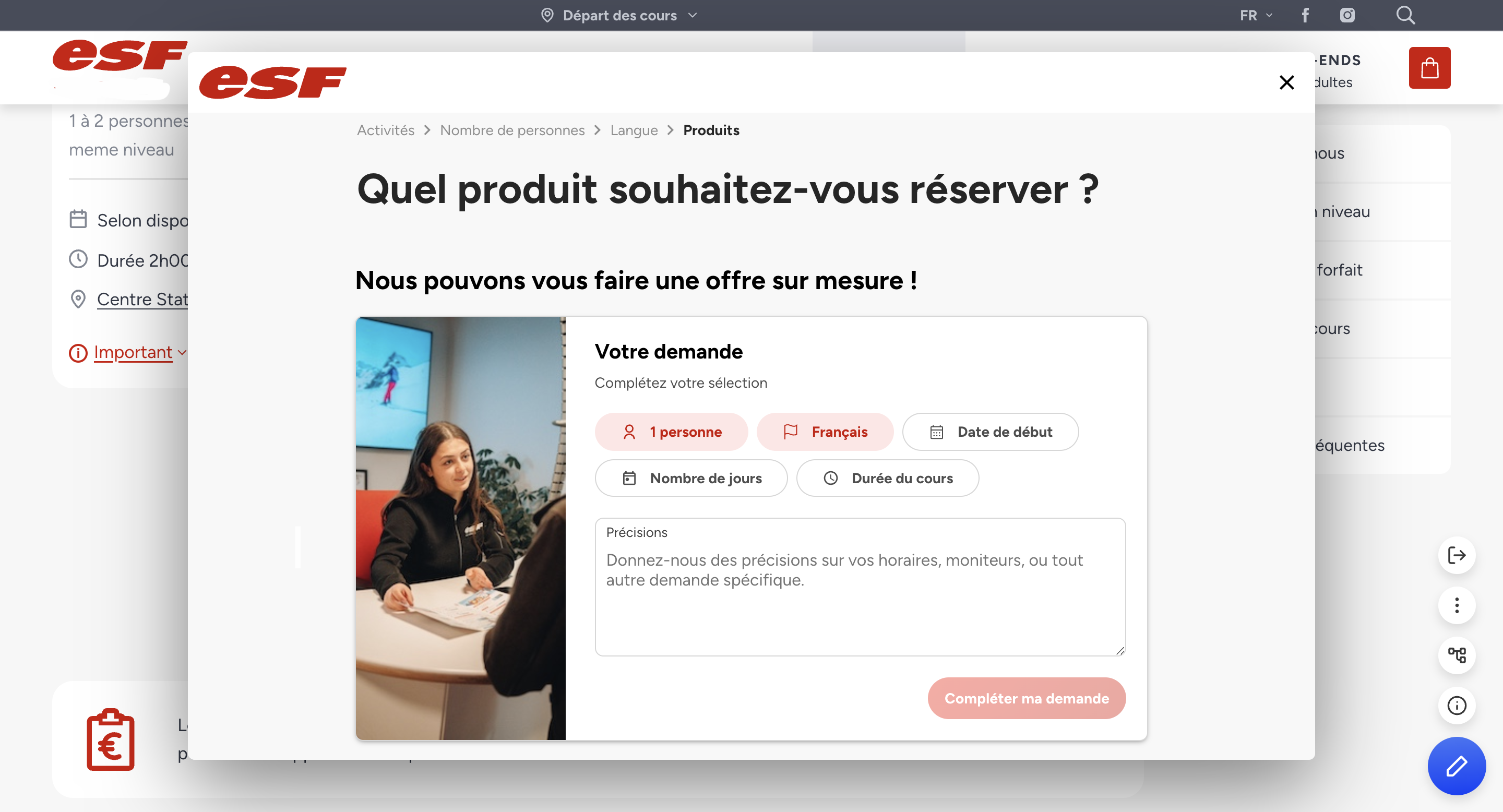 Grâce à la configuration précédente, les clients auront un accès direct au formulaire de gestion commerciale depuis le bouton de réservation. Ils pourront ainsi entrer les informations suivantes : la discipline, le nombre de participant, la langue souhaitée, la date, le nombre de jours et la durée du cours et pourront ajouter un commentaire en supplément (préférence pour un moniteur, etc). Cela créera ainsi un dossier dans la gestion commerciale.