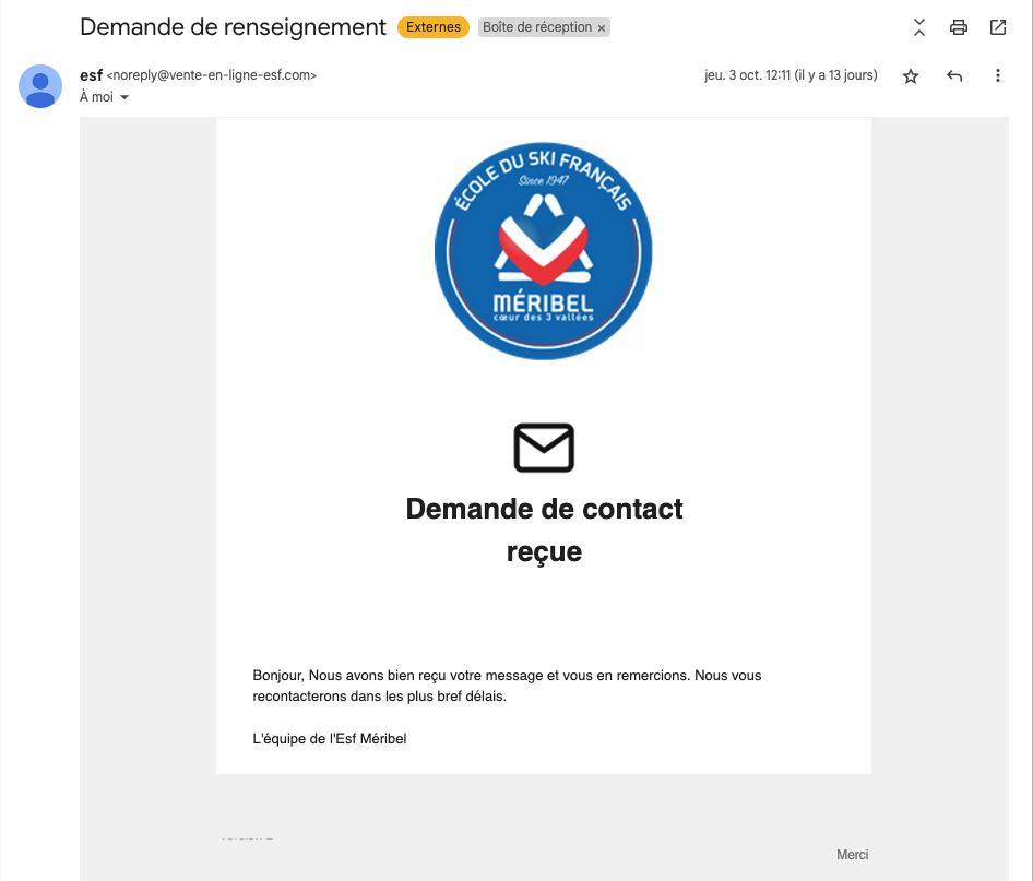 - Le client, quant à lui, recevra automatiquement un e-mail de confirmation indiquant que sa demande sur mesure a bien été prise en compte.
