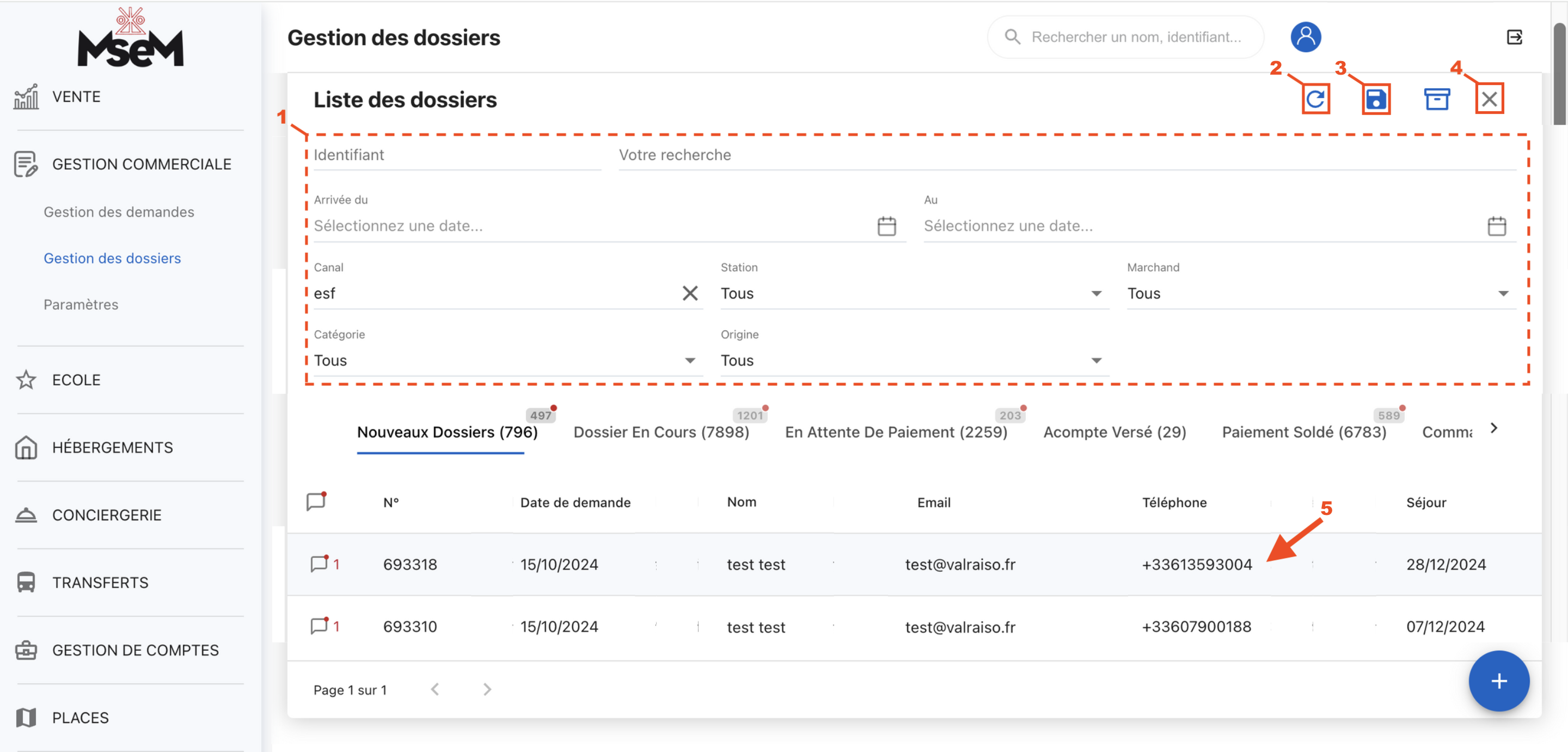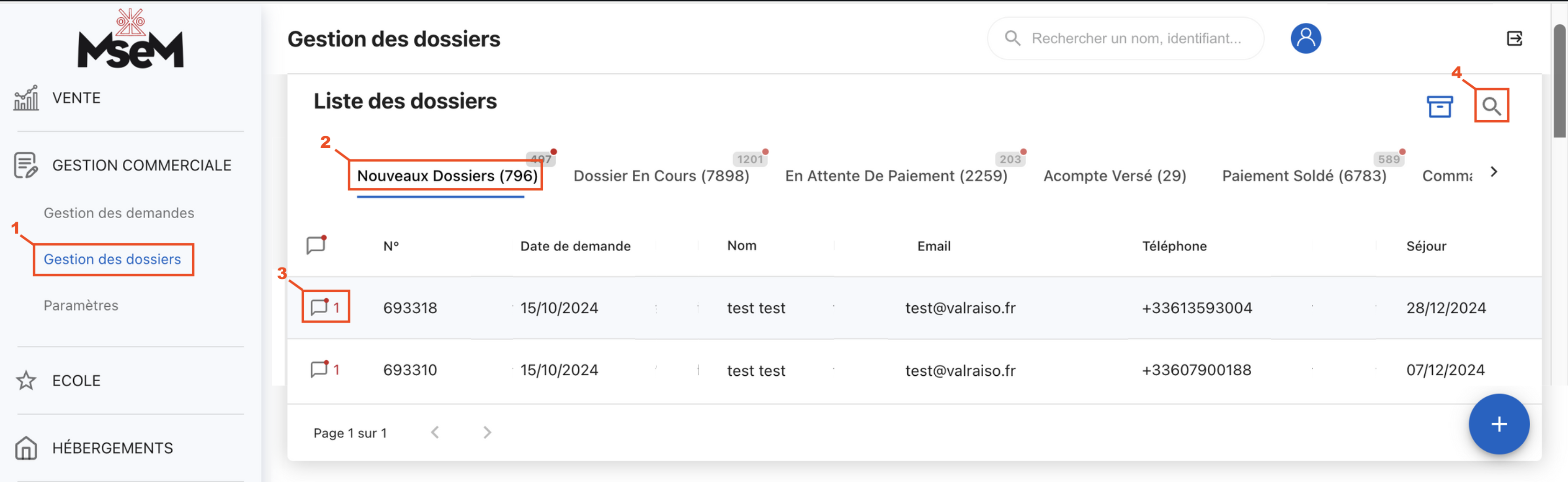 - Dans la zone de recherche, vous pouvez filtrer les dossiers selon différents critères : numéro de dossier, prénom/nom, e-mail, dates de séjour, catégorie de demandes, ou encore leur origine (VEL, formulaire de contact, Carnet Rouge, etc.).
