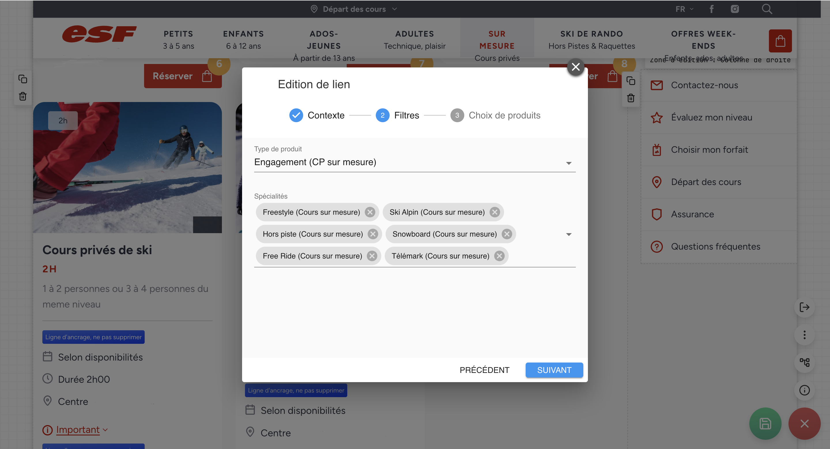 Maintenant, il va falloir vous rendre sur votre site esf afin de paramétrer les blocs produits concernés par les cours sur mesure.