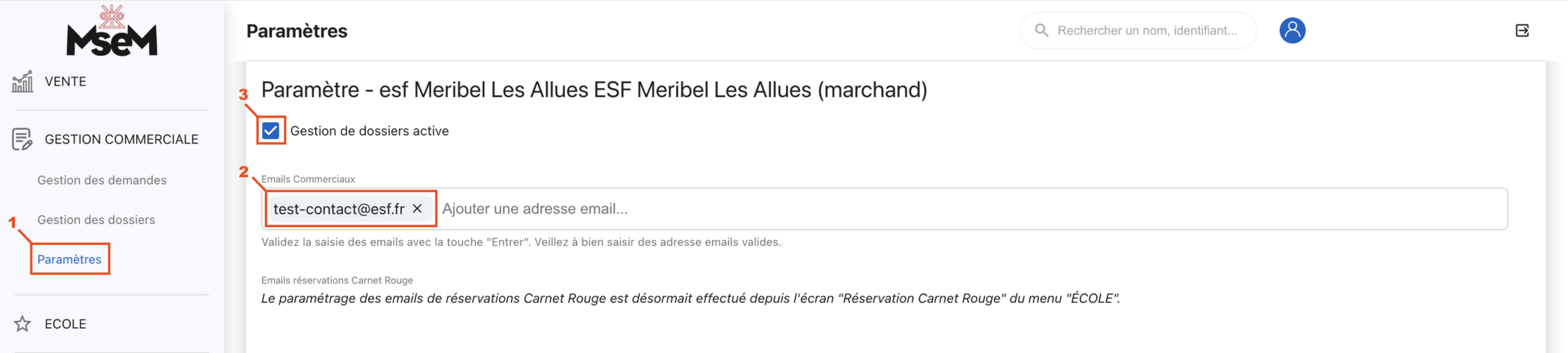 - Saisissez un ou plusieurs e-mails commerciaux pour recevoir les notifications de nouvelles demandes, et appuyez sur la touche Entrée pour valider.
