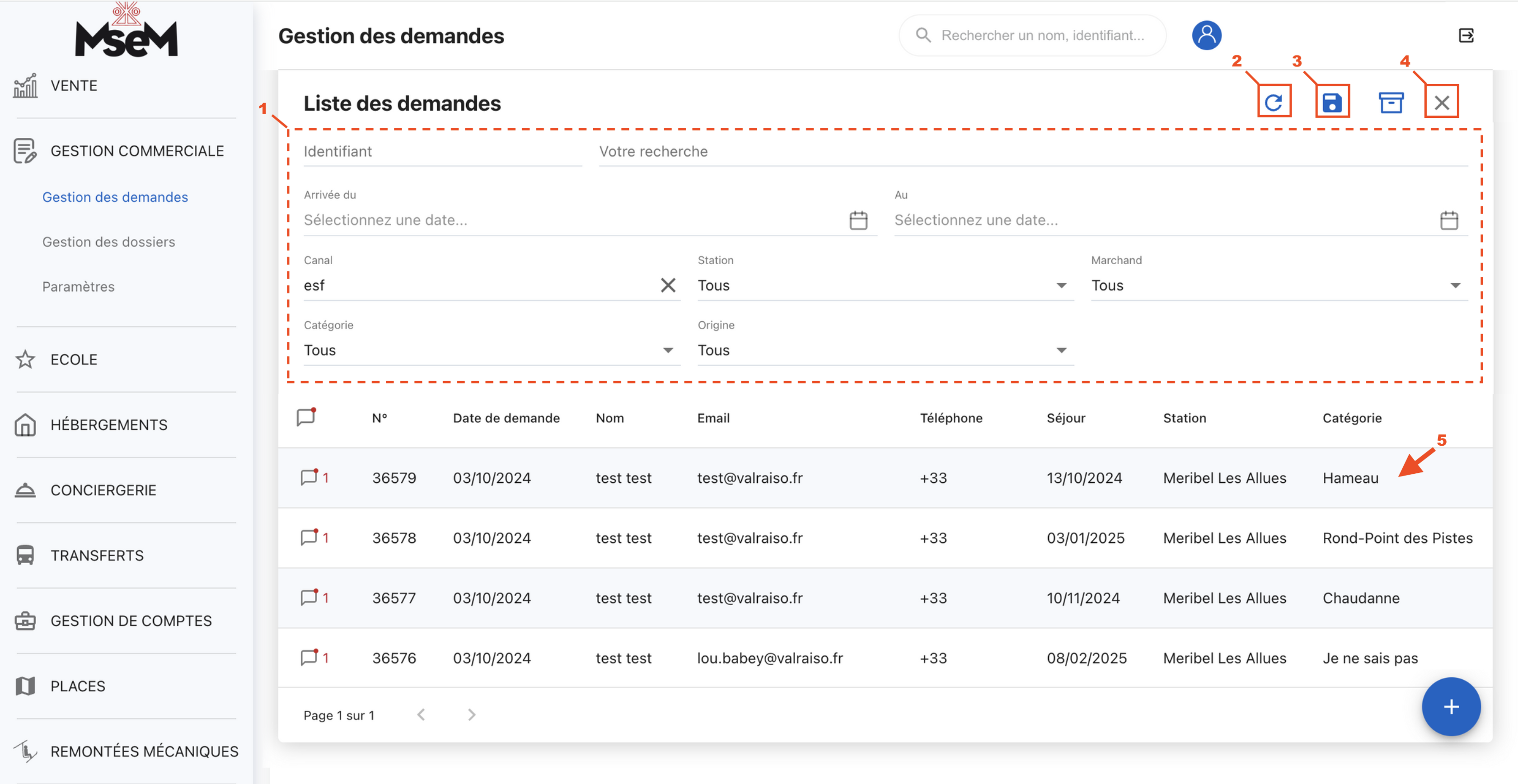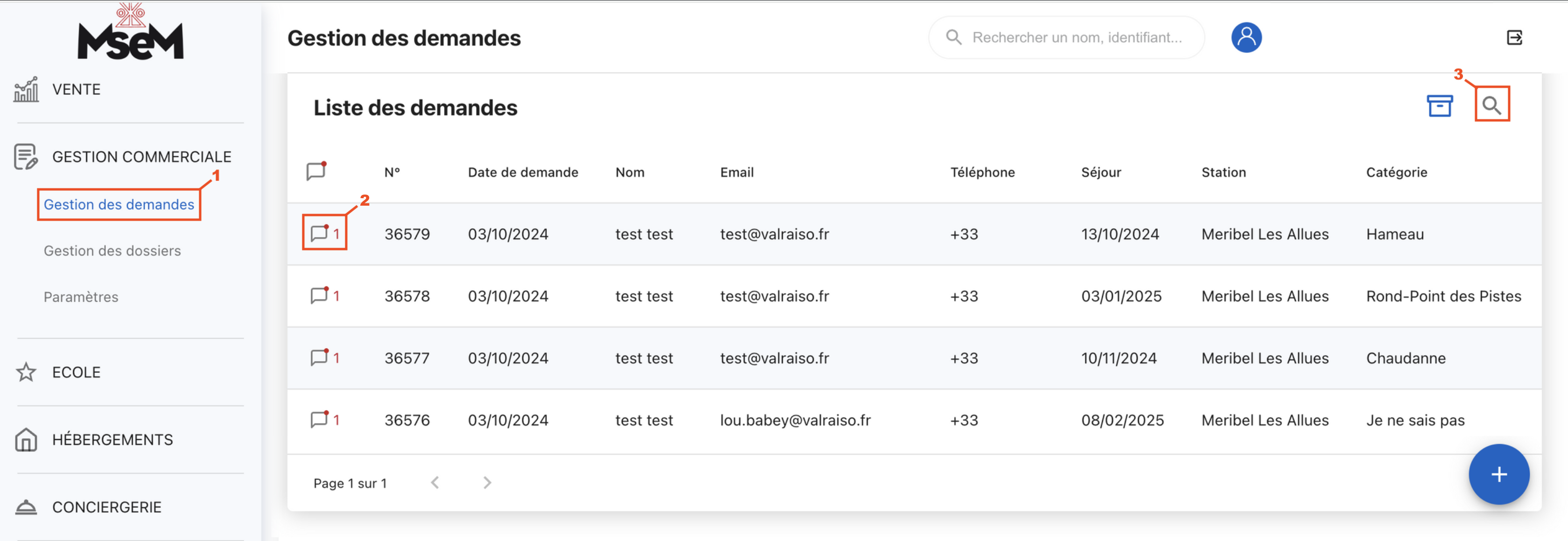- Consultez la liste de toutes les demandes centralisées avec les informations pré remplies par les clients. Les nouvelles demandes sont indiquées par une petite icône message avec une pastille rouge.