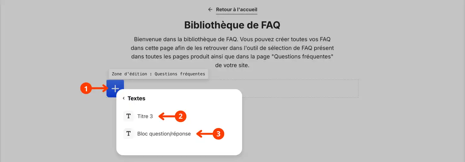 Ces titres servent uniquement à vous repérer : vos clients ne les verront pas (sauf si vous le souhaitez, comme nous le verrons dans la suite du tutoriel). - Bloc question/réponse : cliquez pour créer une nouvelle question-réponse.