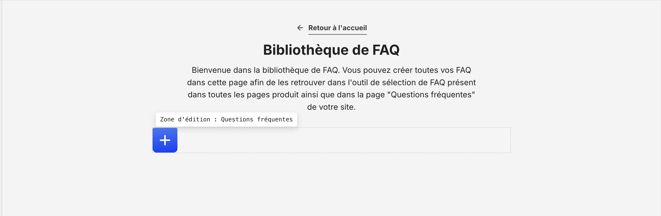 - Allez ensuite sur la page où vous souhaitez intégrer votre FAQ et sélectionnez la zone d’ajout (généralement en bas de page, sous les blocs produits).