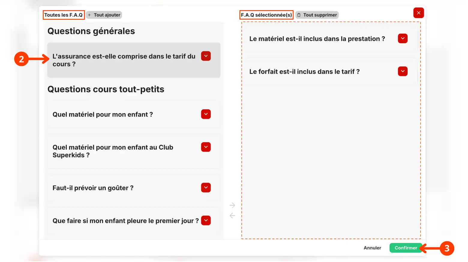 Si vous souhaitez enlever une FAQ, cliquez dessus, elle repassera dans la première partie. - Une fois votre choix fait, appuyez sur le bouton "Confirmer" et enregistrez vos modifications.