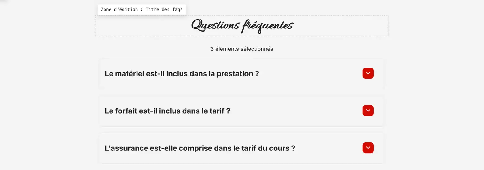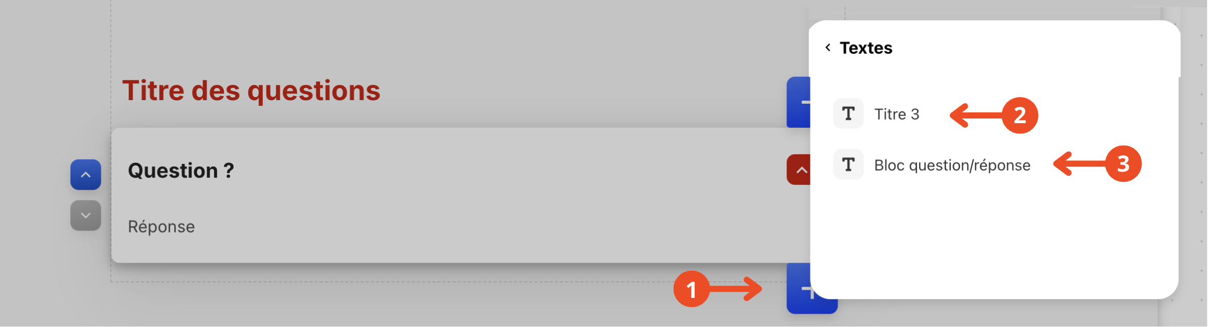 Ces titres sont simplement à disposition pour vous aider à vous retrouvez dans votre liste de FAQ. Vos clients n'y auront pas accès. - Bloc question/réponse : pour créer vos questions-réponses, cliquez dessus, puis sur la section, cliquez sur le texte "Question ?" et écrivez, même chose ensuite sur la partie "Réponse".