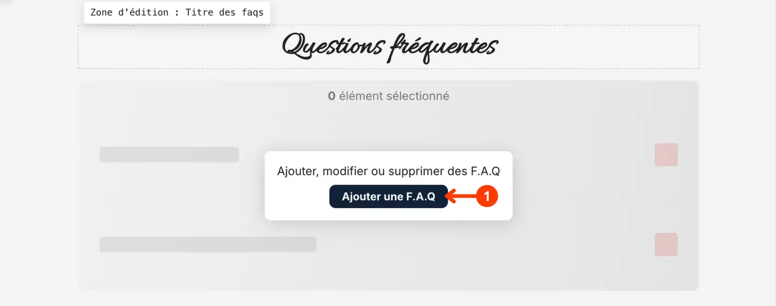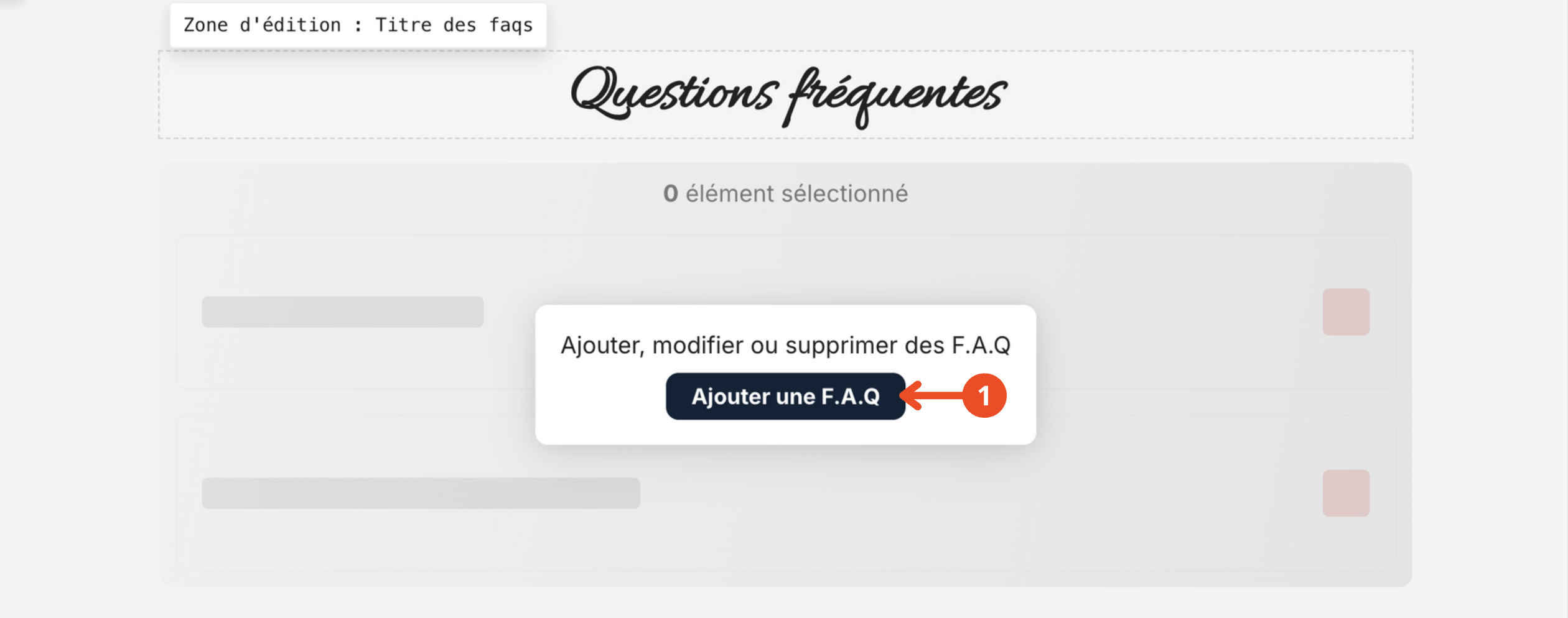 - Dans cette zone, lorsque vous glisserez votre souris, vous verrez apparaître une fenêtre avec un bouton "Ajouter une F.A.Q", cliquez dessus.